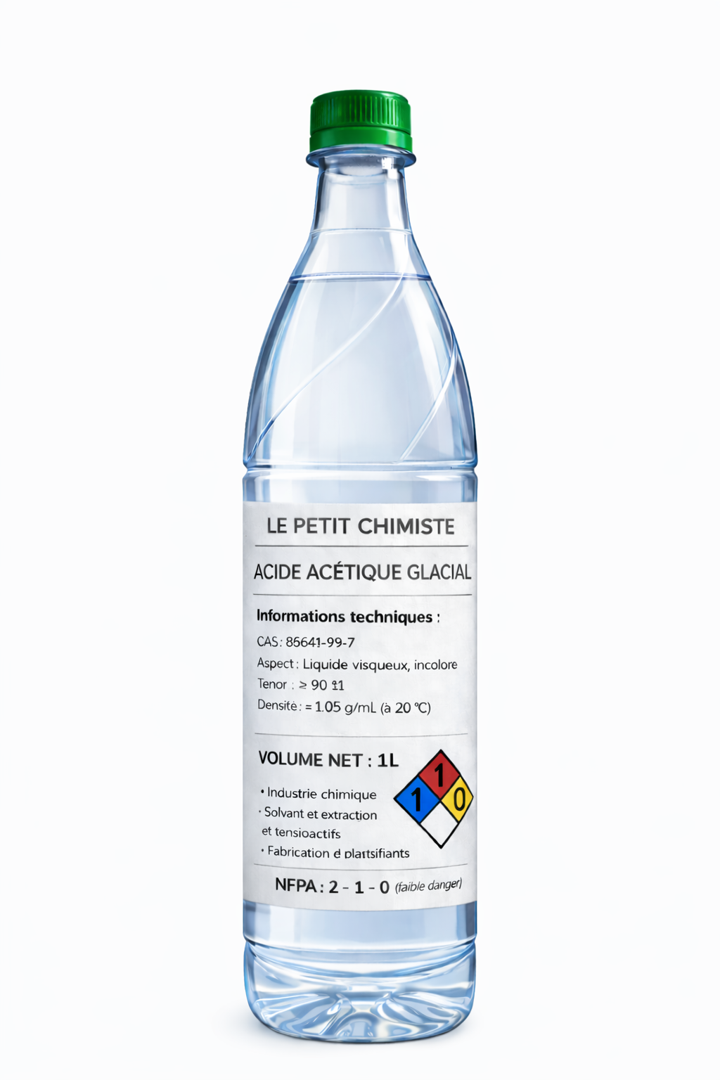 Acide acétique glacial (CH₃COOH) à 99 %, très concentré, incolore, fortement corrosif, à odeur piquante caractéristique.