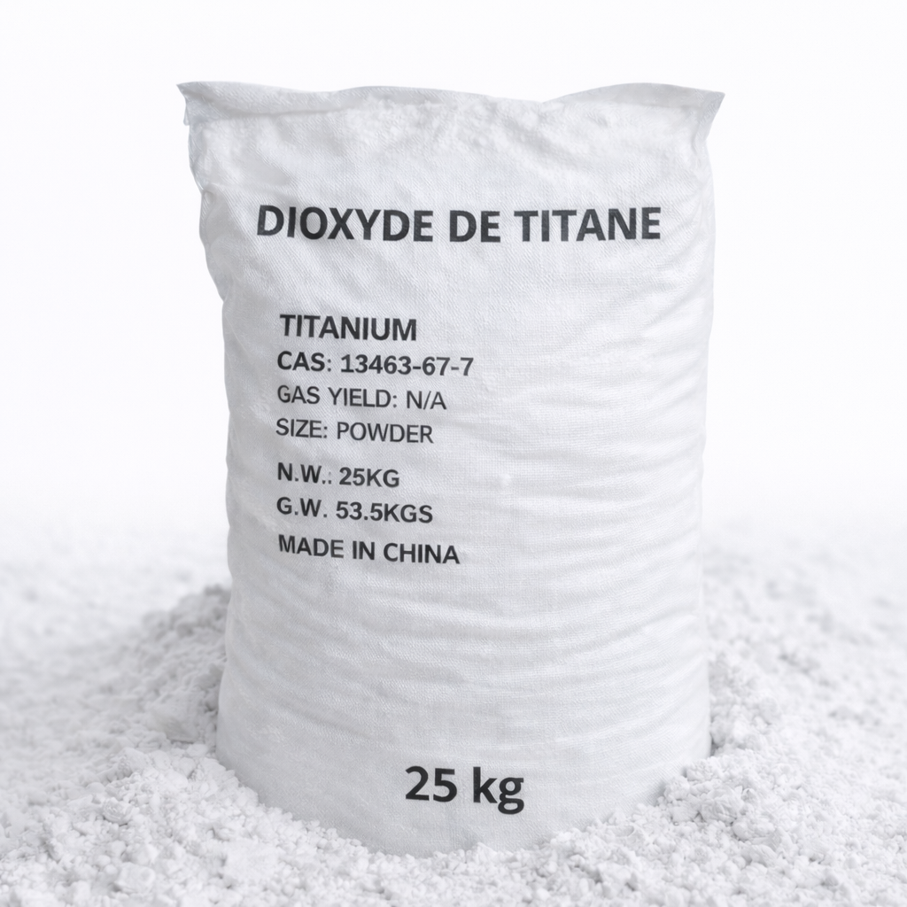Dioxyde de titane pur (TiO₂), issu de minerais naturels (rutile, anatase), transformé par procédé industriel et micronisé sous forme de poudre fine blanche.Présentation :