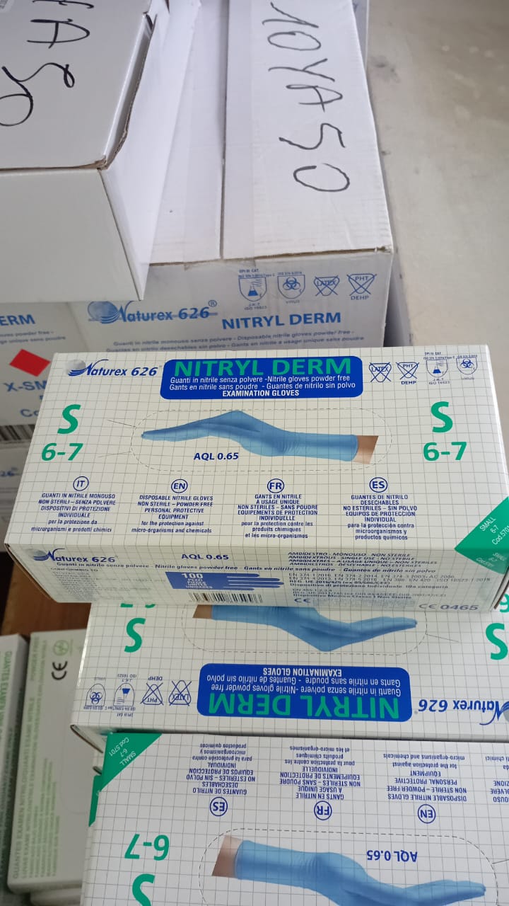 Gants souples, résistants, généralement de couleur bleue ou noire, conditionnés en boîte distributrice.